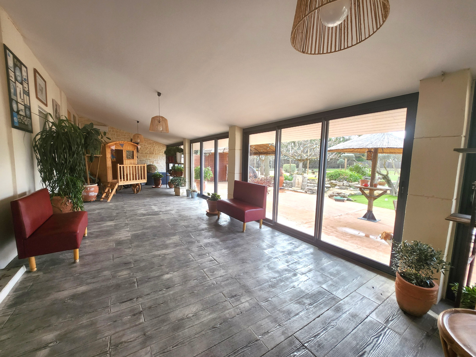 L'habitation principale, de plain-pied, propose un séjour/cuisine de 60 m² ouvert sur la véranda climatisée de 60 m² également, une buanderie et un dressing, trois chambres, un WC indépendant ainsi qu'une salle de bain avec baignoire et douche.